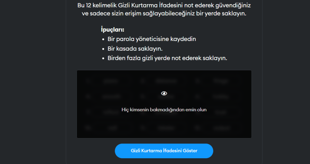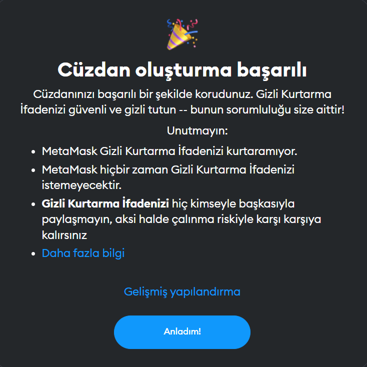 Adım 4: Gizli Kurtarma İfadenizi Yedekleyin: Metamask, size seed phrase de verir (tohum ifadeleri, tohum kelimeleri olarak da geçebilir). Bu 12 kelimeyi kimseyle paylaşmamanız ve bir yere kaydetmeniz çok önemlidir. Genelde kripto camiasında kabul gören yöntemler internet bağlantısı olmayan bir bilgisayarda, USB bellekte veya eski usul bir kağıda yazarak muhafaza etmektir. Seed kelimeleri, cüzdanınızı kurmanızı sağlar ve hesabınızı kurtarmak için kullanılır. Bu kelimeler olmaz ise MetaMask cüzdanınıza gelecekte başka bir aygıttan erişemez, yeni bir browsera kuramazsınız, şifrenizi hatırlasanız bile.