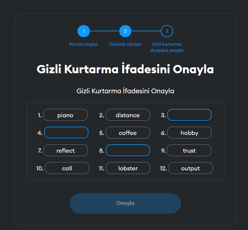 Örneğin burada 12 kelimelik gizli kurtarma ifadesinin bazılarını doldurmamızı istiyor. İstenen kelimeleri yazdıktan sonra onayla butonuna basıyoruz ve işlem tamam.
