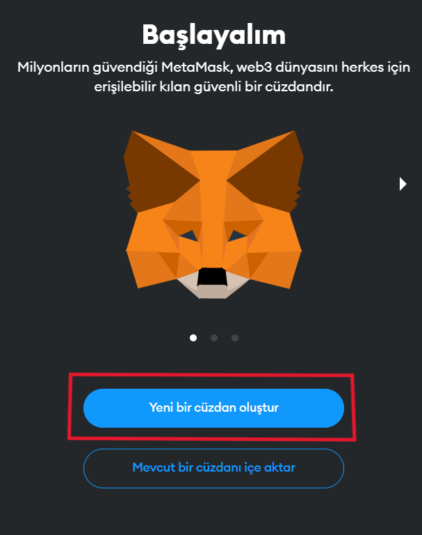 Adım 2: Metamask’ı yükledikten sonra: Bir cüzdan oluşturmanız gerekir. Bunun için Metamask’ı açın ve “Yeni Cüzdan Oluştur” düğmesine tıklayın.