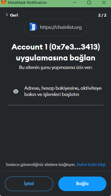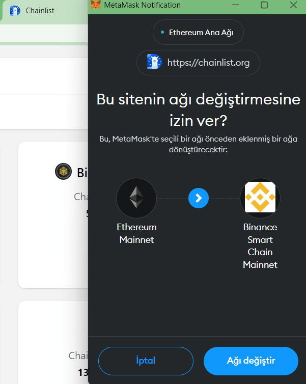 6- Add to Metamask yazısına tıkladığımızda cüzdan karşımıza aşağıdaki ilk görseldeki bir pencere açarak onay isteyecek. Onay verdikten sonra ikinci görseldeki gibi bir pencere açılarak size ağ değiştirmek isteyip istemediğinizi soracak. Biz bir önceki aşamada onay verdiğimizde yeni ağ cüzdana zaten eklendiği için burada karar size kalmış.