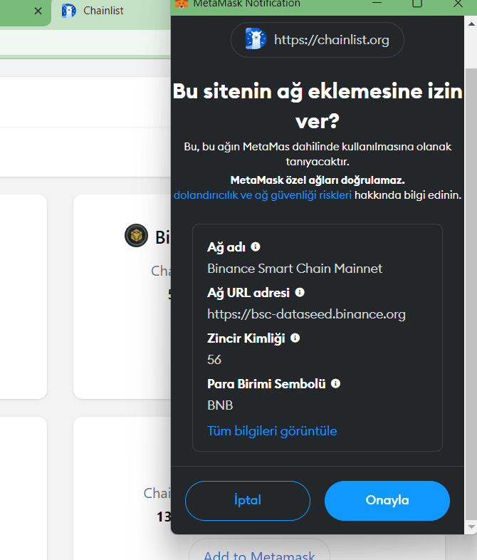 5- Chainlist sitesine bağlı olduğumuza göre artık istediğimiz tüm ağları cüzdanımıza ekleyebiliriz. Bunun için tek yapmamız gereken ağların altında bulunan ‘Add to MetaMask’ yazısına tıklamak. Bu yazıda örnek olarak BNB Smart Chain’i (Eski adı ile Binance Smart Chain) ekleyeceğim.