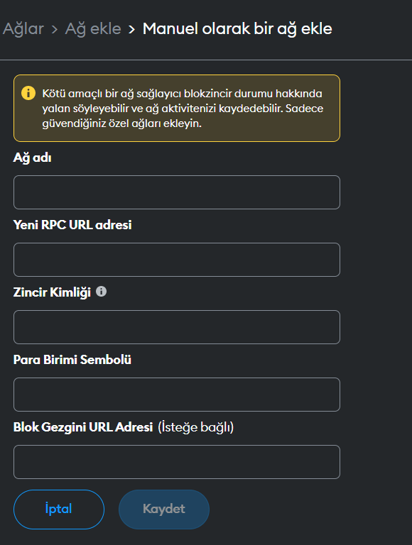 8- Ekstra ( Manuel Kurulum) : Çok tercih edilen bir yöntem değildir. Belki airdrop peşinde koşarken yeni çıkan bir ağın testnetini cüzdanınıza eklemek amacıyla böyle bir şey yapmak zorunda kalabilirsiniz. Bir ağı MetaMask’e manuel olarak eklemeniz gerekirse 5. adımdaki gibi cüzdanın en üst kısmında bulunan ağa tıklayıp, listenin en altındaki ağ ekle bölümüne tıklıyoruz. Önümüze gelen listenin en altında “Manuel olarak bir ağ ekle” yazısına tıkladığımızda ise aşağıdaki görselle karşılaşıyoruz. Burada yapmamız gereken istenen bilgileri doğru şekilde girmek. Aşağıya BNB Testnet’in bilgilerini örnek olarak ekliyorum. Bu bilgileri eksiksiz ve hatasız bir şekilde girdikten sonra “Kaydet” tuşuna basarak yine onay veriyoruz.