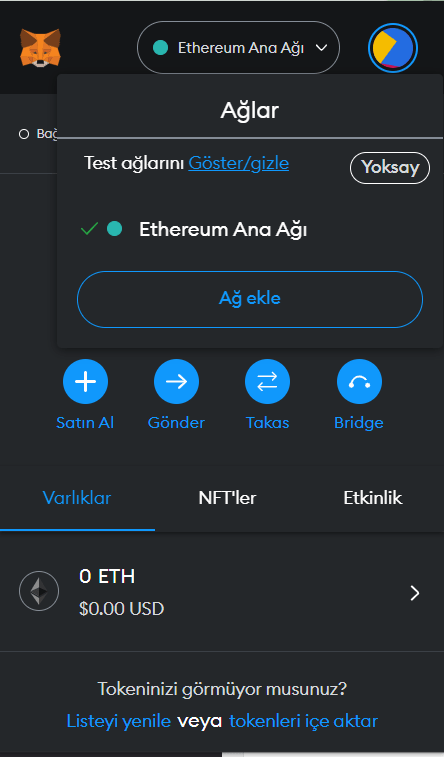 7- Bir önceki adımda ağ değiştir deseniz de demeseniz de, cüzdanınıza eklediğiniz ağlar arasında geçiş yapmak da oldukça kolay. Cüzdanınıza tıkladığınızda en üstte ortada yazan ağa tıklarsanız, ekli olan bütün ağları görebilir, aralarında geçiş yapabilirsiniz.