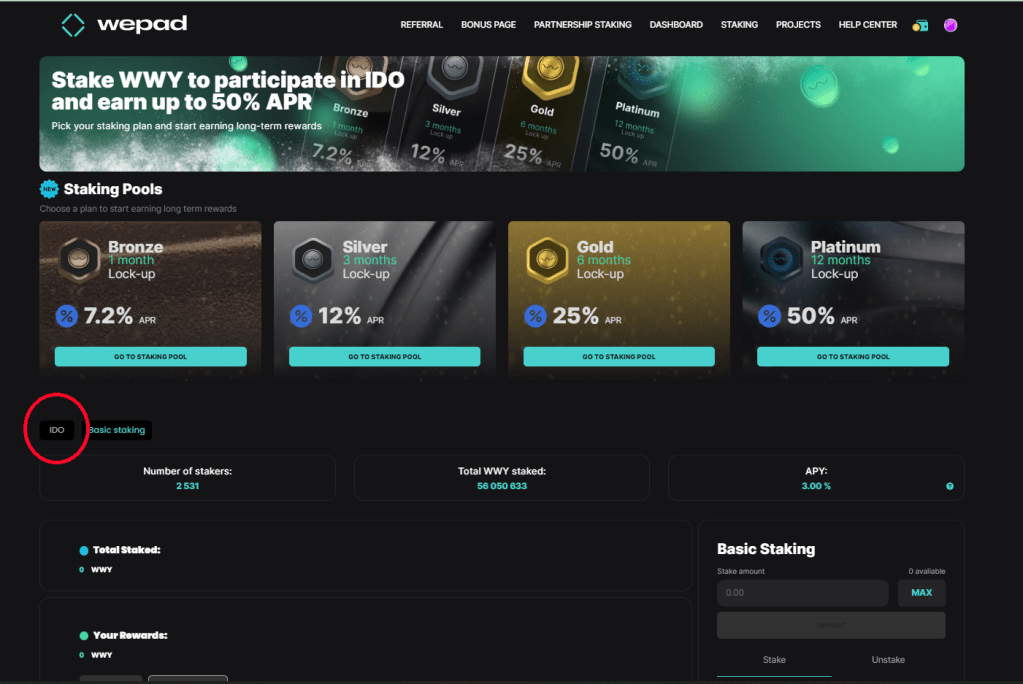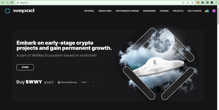 1) www.wepad.io adresine gidiyoruz. Karşımıza çıkan sayfada “STAKE” yazısını gördüğümüz kutuya tıklıyoruz.