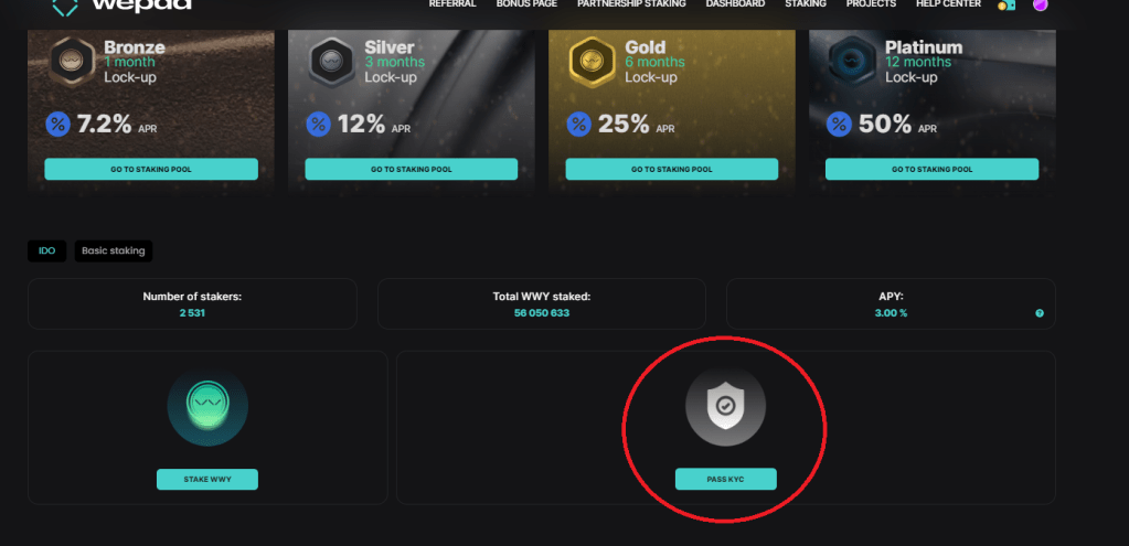 2) Tam olarak bu şekilde bir sayfa bulacağız önümüzde. Burada KYC nerede diye ben aradım, siz aramayın. Bronze Tier’ın hemen altında IDO – Basic Staking seçenekleri var, IDO’yu seçiyoruz ve karşımıza iki seçenek çıkıyor.