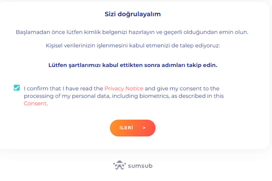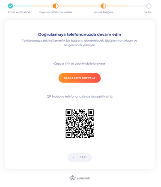 3) Burada “PASS KYC” seçeneğine tıklıyoruz. Bizi “in.sumsub.com” diye gözünüze garip gelebilecek bir adrese gönderiyor. Sıkıntı yok, Sumsub bir online kimlik doğrulama hizmeti. İlk defa kullandım ve çok beğendim. Arayüzü, hızı, Türkçe desteği olması çok güzel. Ayrıca fotoğraf çekme veya kamera kullanmanızı gerektiren aşamalarda QR kodu okutarak o aşamayı telefondan tamamlamanıza da izin veriyor olması çok hoşuma gitti.